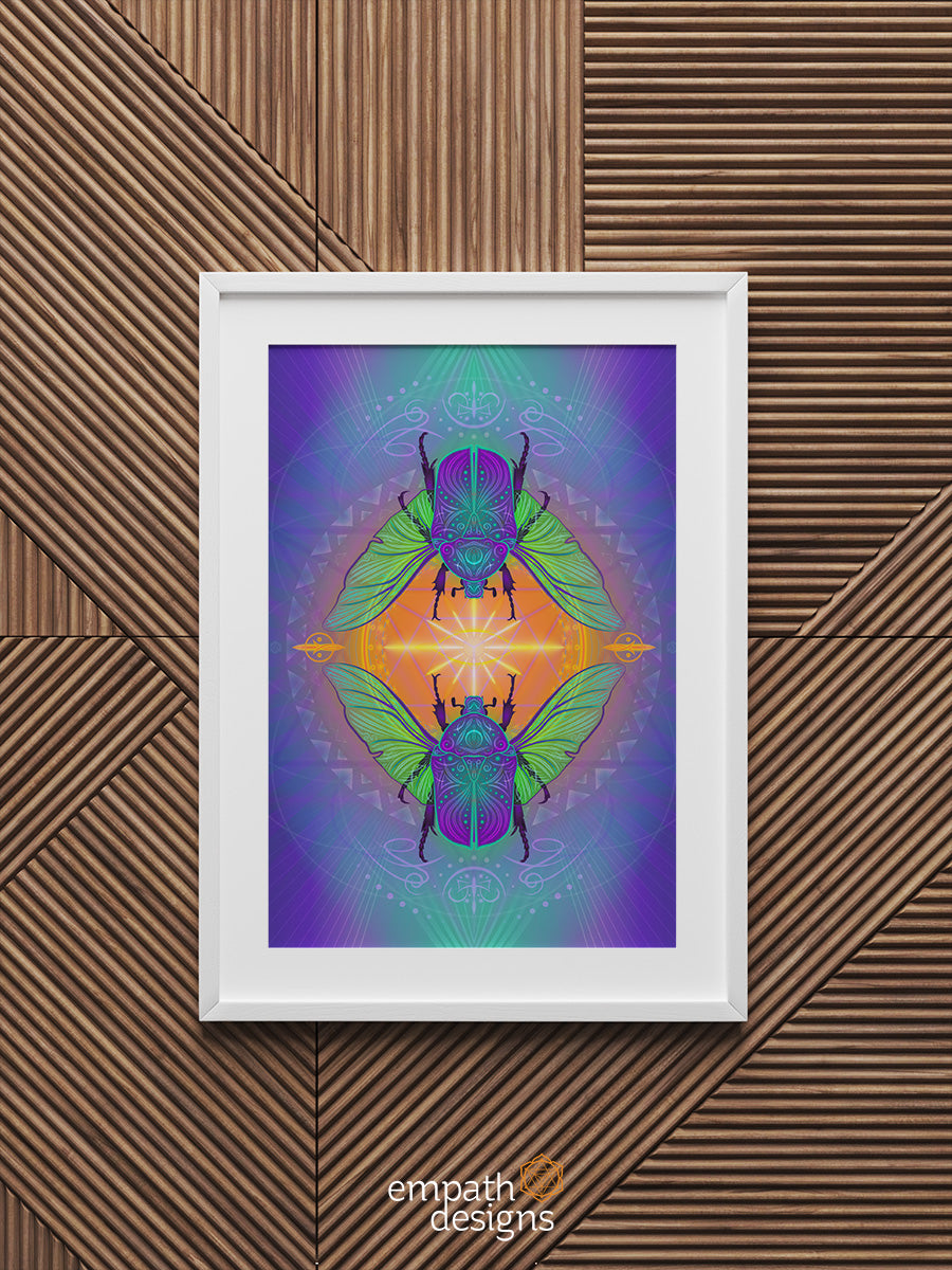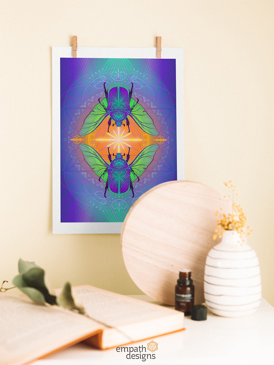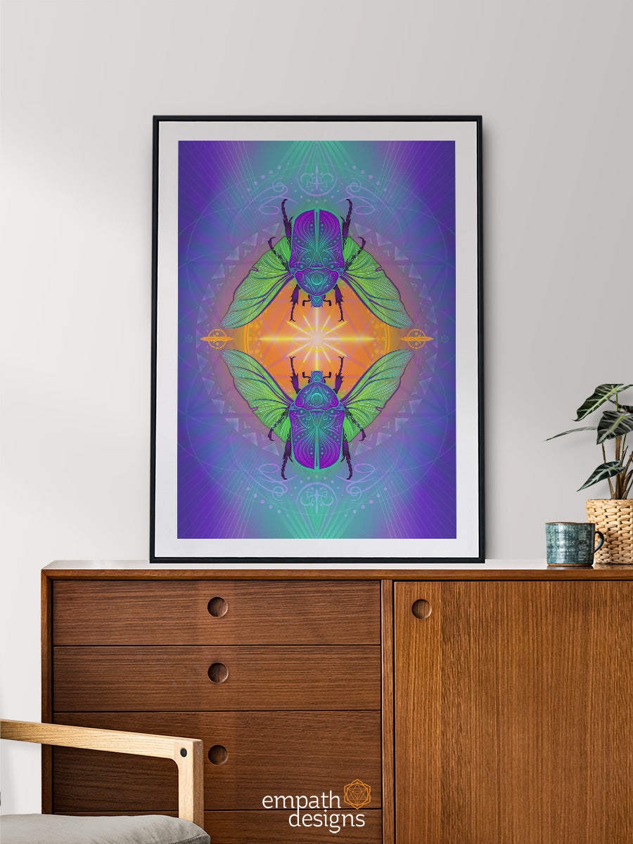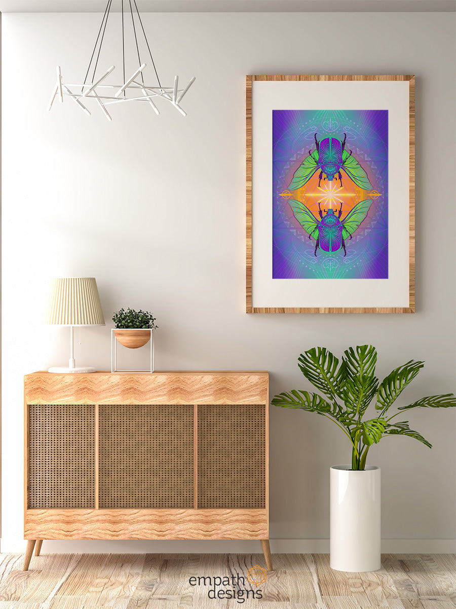 Printed on exquisite sustainably sourced hahnemuhle paper, this fine art piece justifies its vibrancy as it captures the essence of Scarab symbolism.