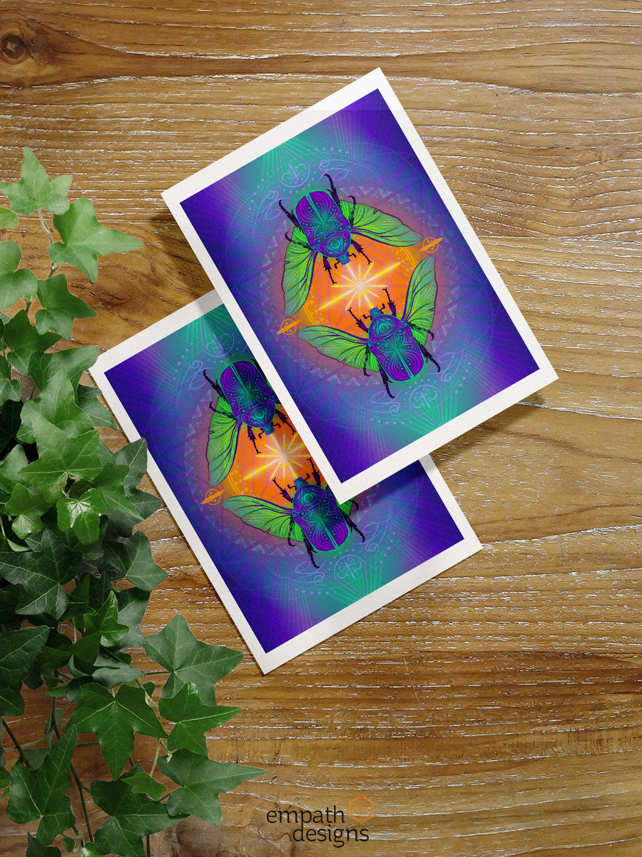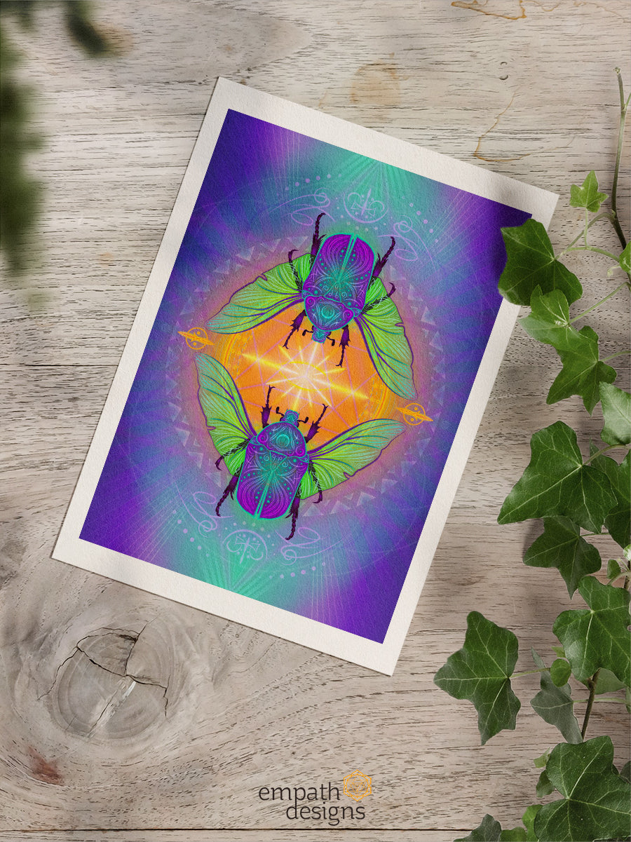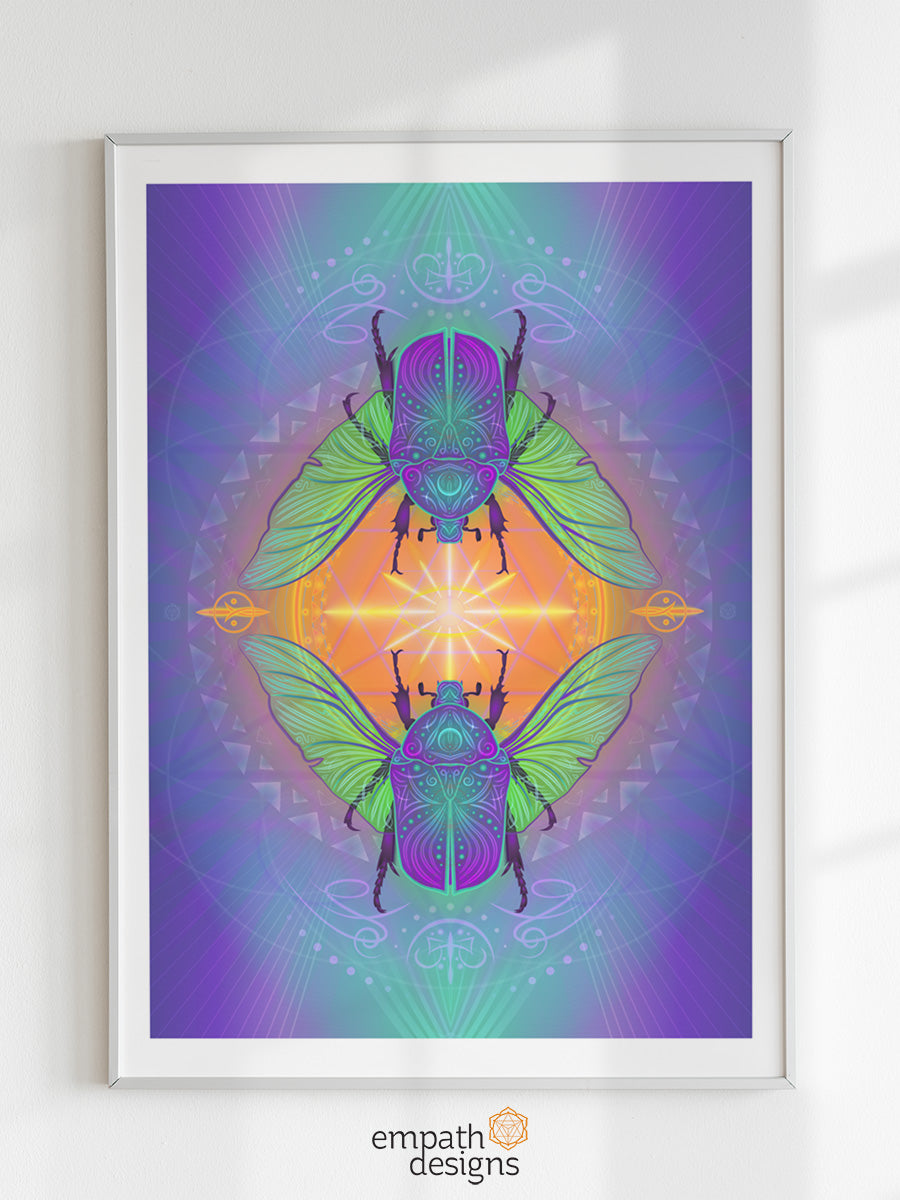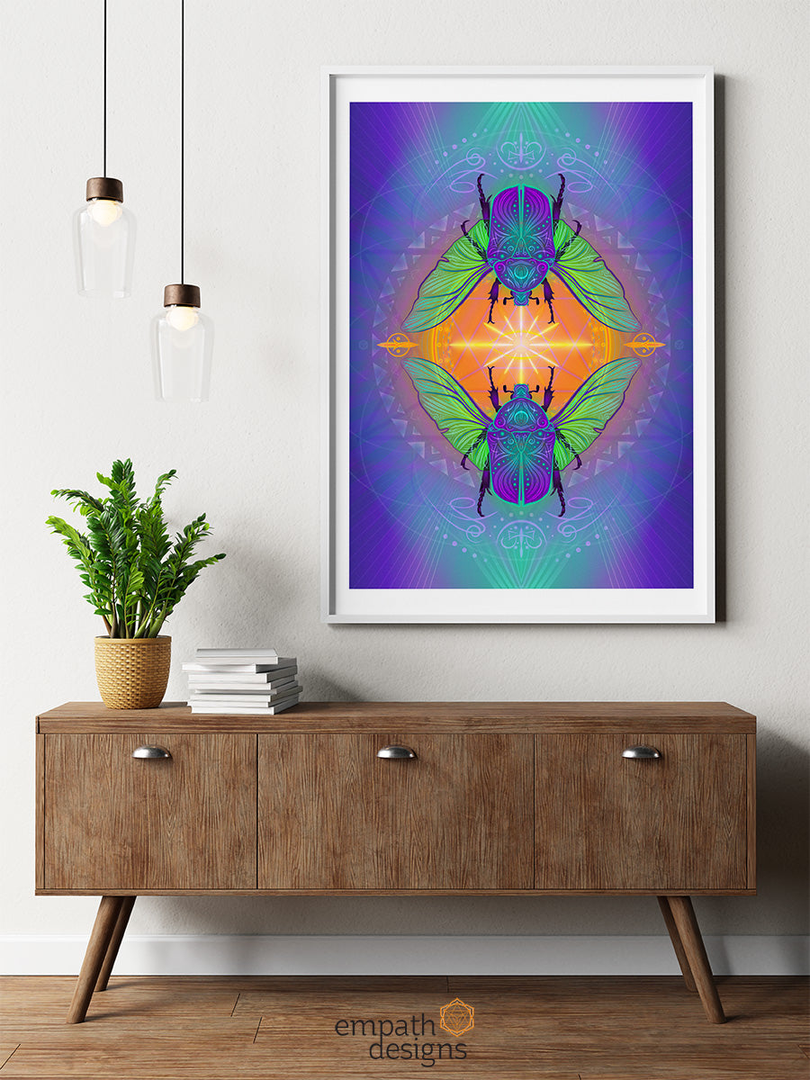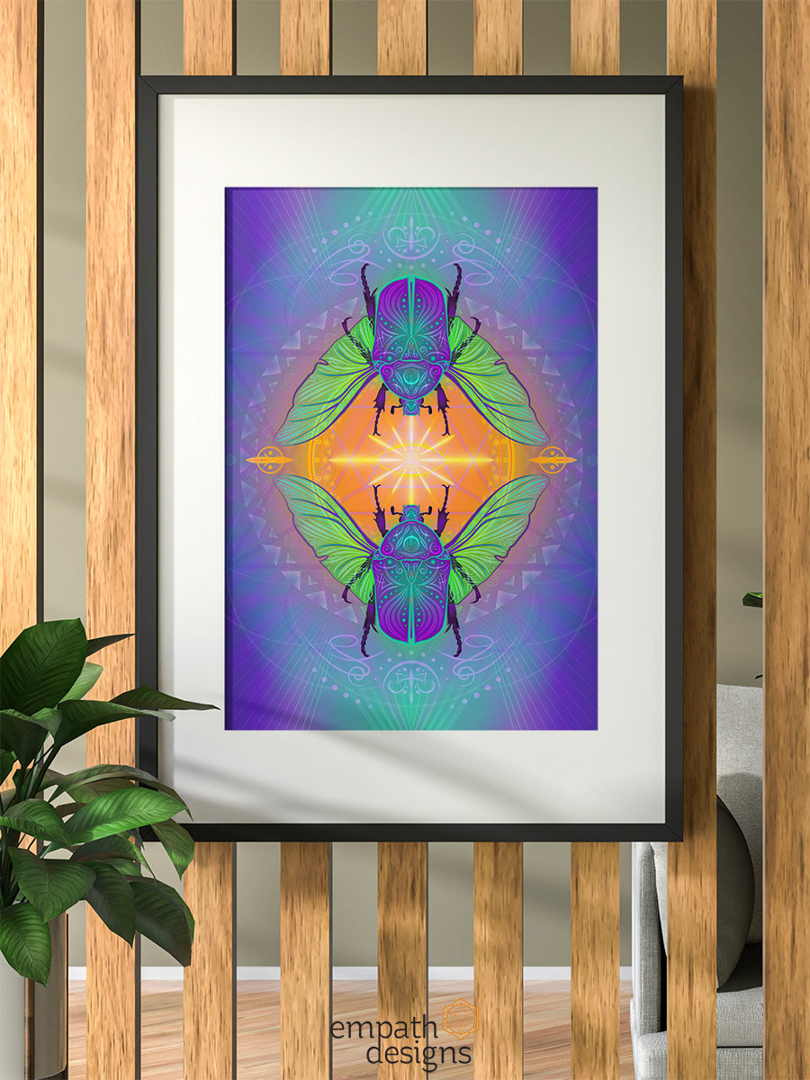 Printed on exquisite sustainably sourced hahnemuhle paper, this fine art piece justifies its vibrancy as it captures the essence of Scarab symbolism.