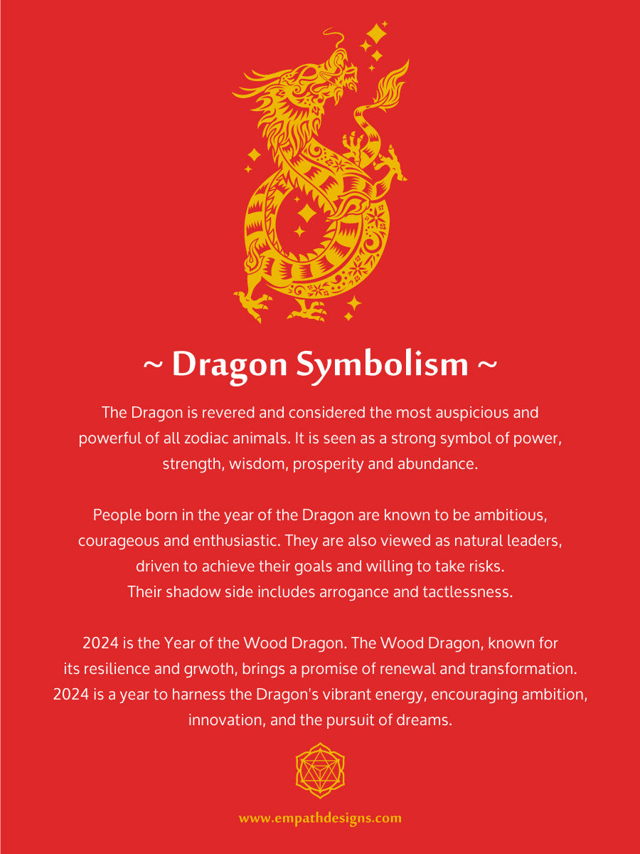 The Dragon is revered and considered the most auspicious and powerful of all zodiac animals. It is seen as a strong symbol of power, strength, wisdom, prosperity and abundance.