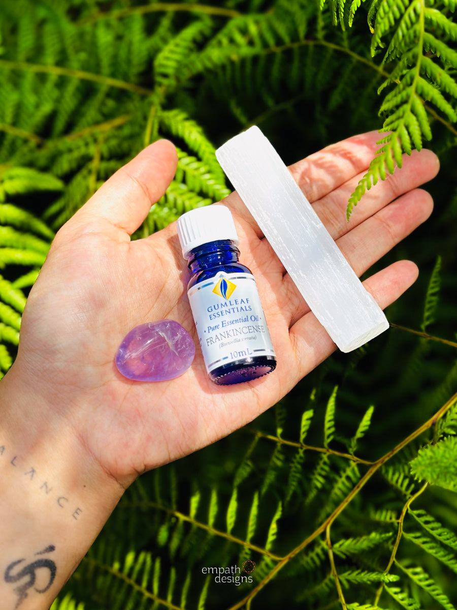 Use Frankincense and Amethyst together during meditation while visualising the Lotus to empower the Crown Chakra. In unity, these items may assist you with being aware of your spiritual journey while practicing mindfulness, exploring your true higher purpose.