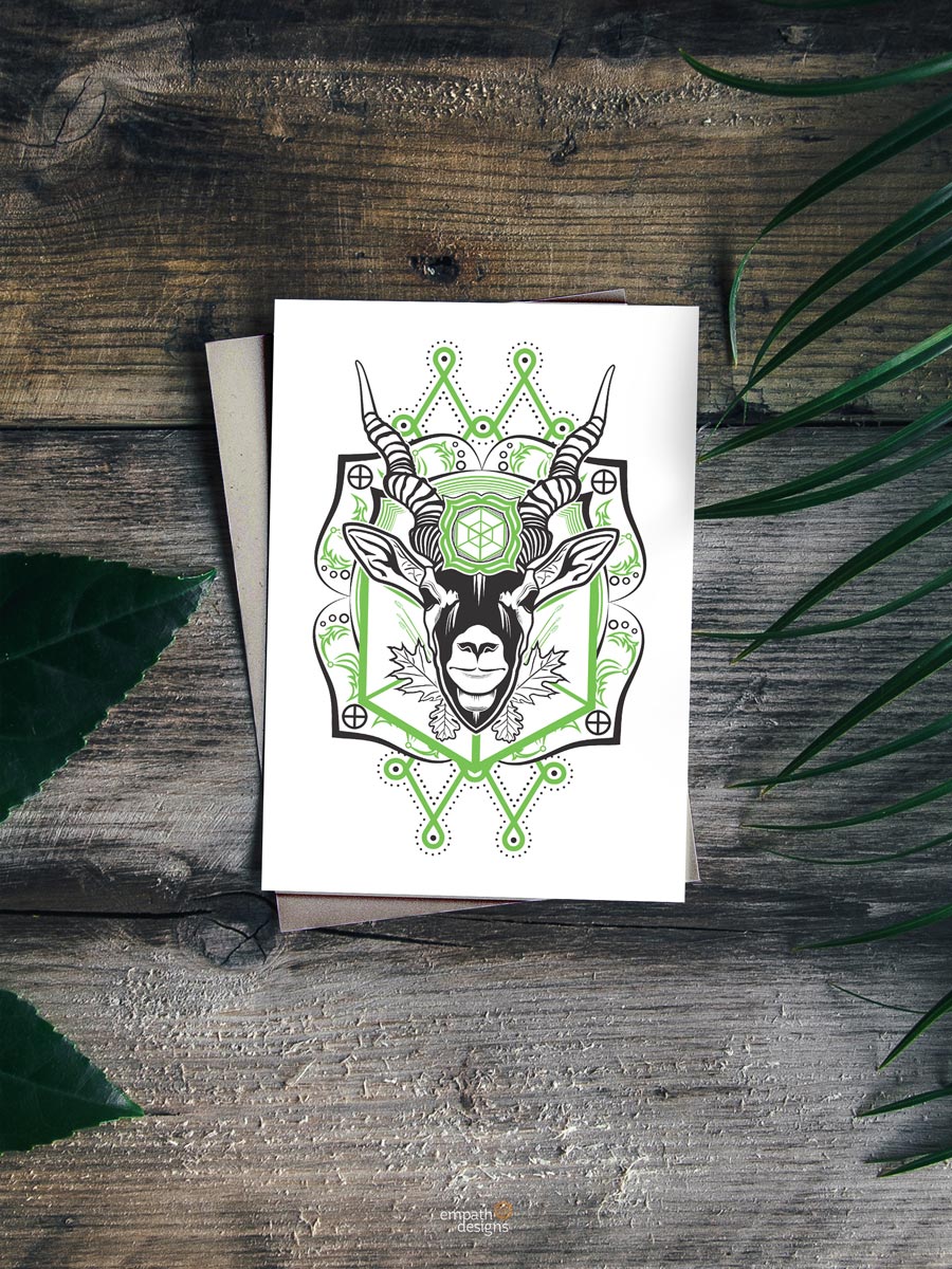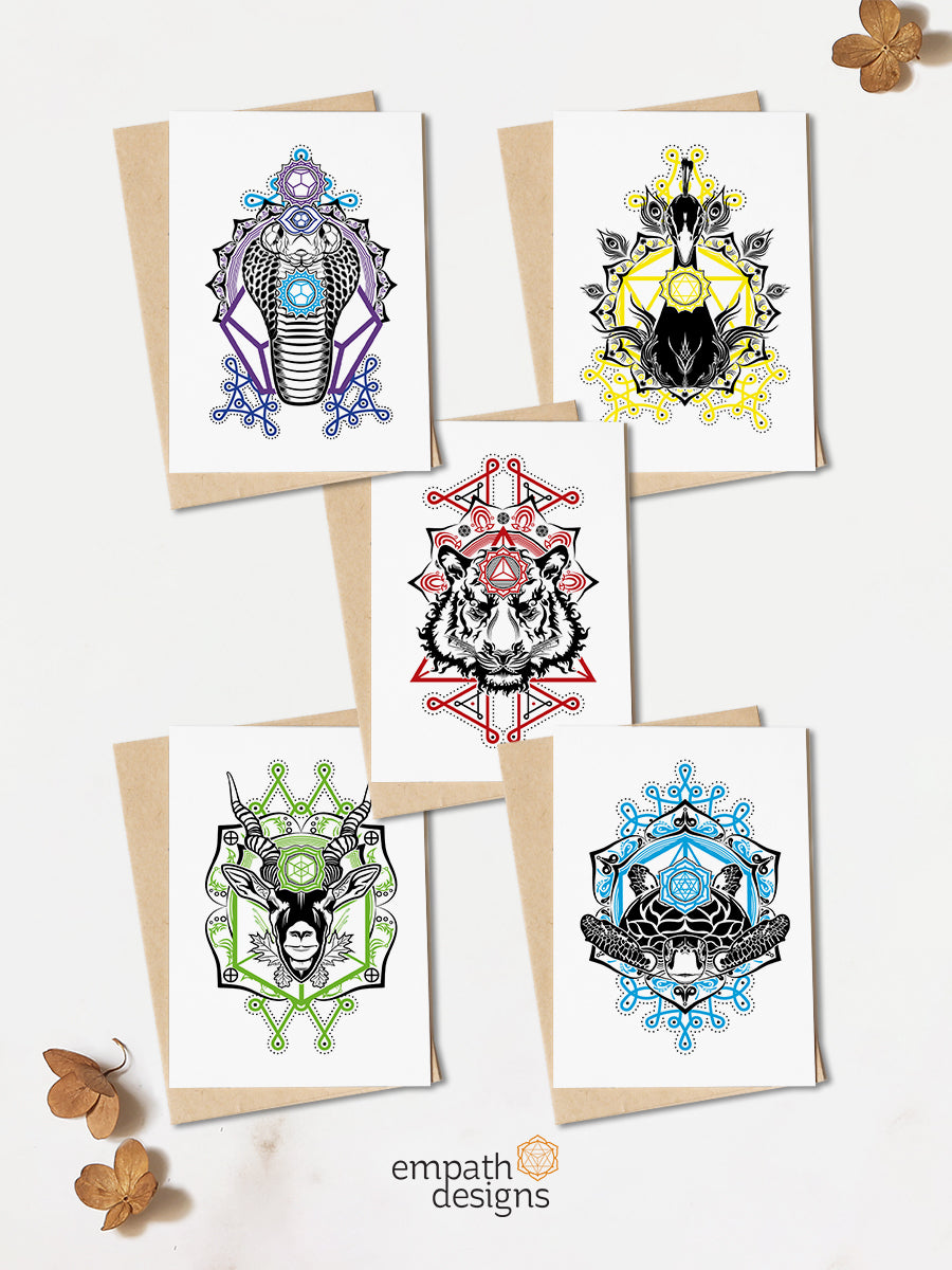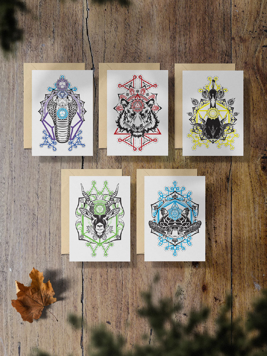 5-pack greeting card bundle of the Animalis collection: Blackbuck Antelope (Earth), Hawksbill Turtle (Water), Bengal Tiger (Fire), Indian Peafowl (Air) and Spectacled Cobra (Aether).
