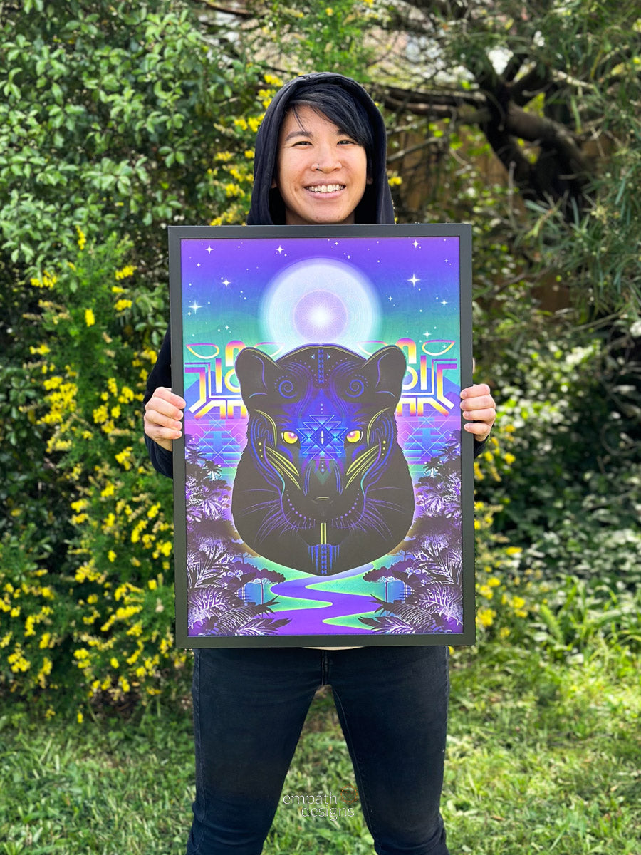 "Panther's Grace" reflects the graceful dance of navigating challenges with quiet power, teaching us to observe before acting, respond thoughtfully rather than reacting emotionally, honour intuition as a source of wisdom and to embrace both shadow and light to create balance.