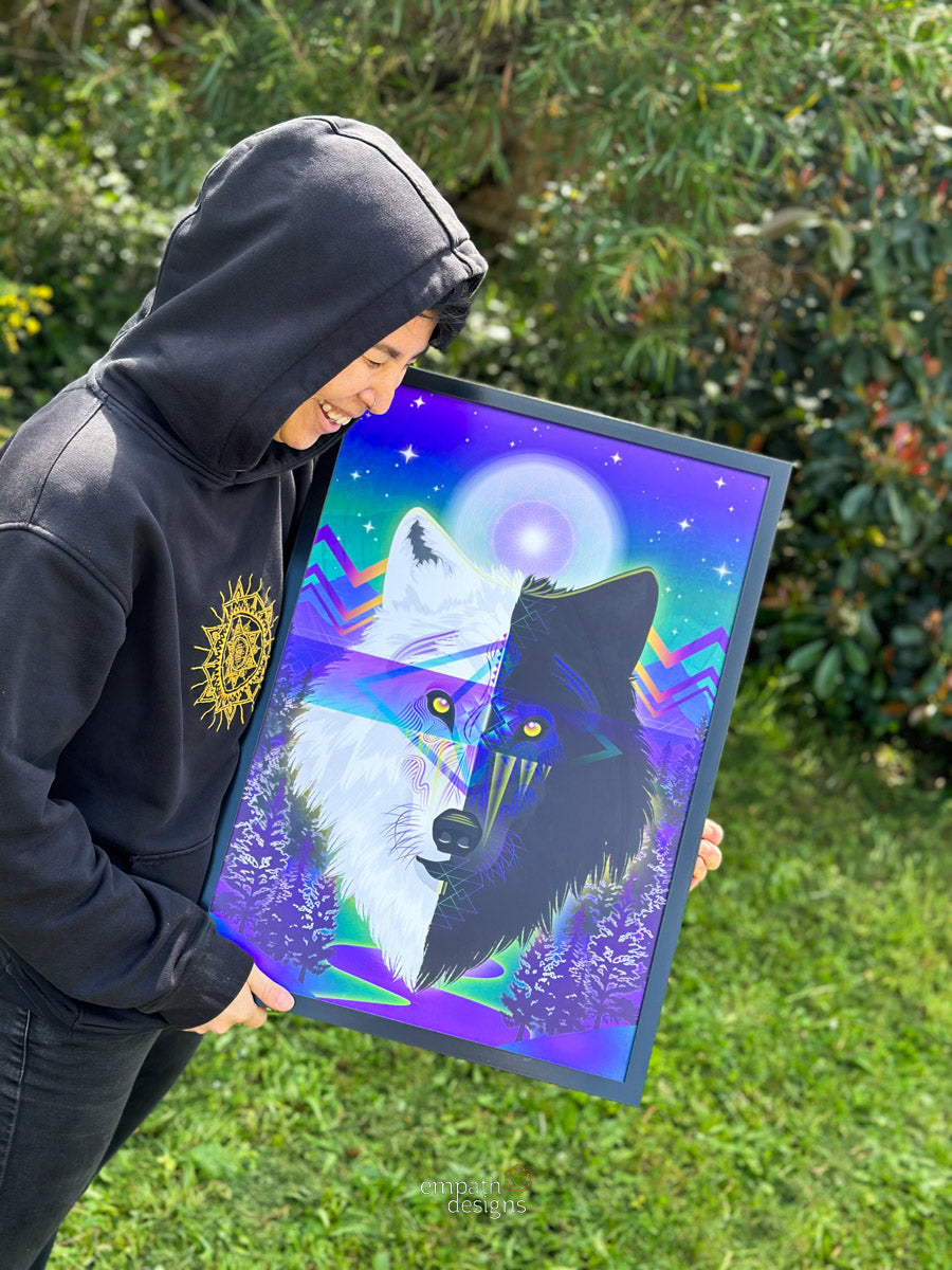 This artwork captures the essence of masculine energy: strength, loyalty, freedom, and courage. It reflects the Wolf's natural instincts, teaching us the art of discernment—a power that matures with experience and requires embracing both the light and shadow of each decision.