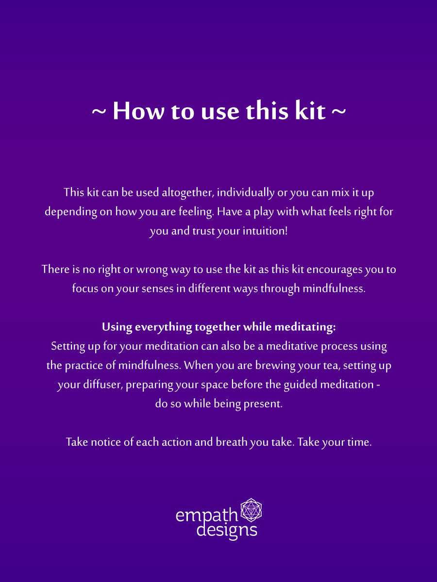 - Set aside a dedicated time for your meditation or mindfulness practice. If using the kit with the guided meditation, we recommend to set aside approximately 30 minutes.