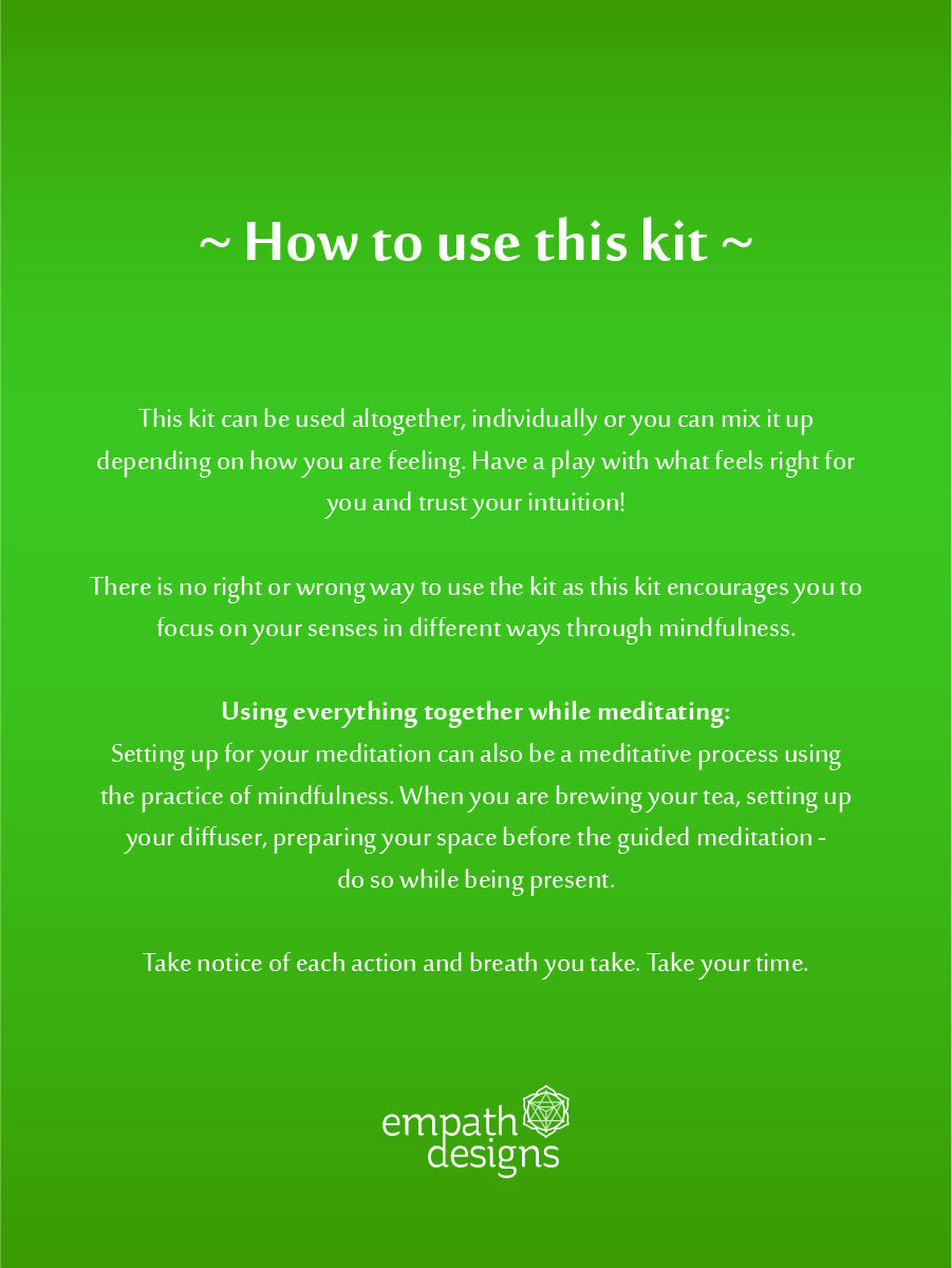 - Set aside a dedicated time for your meditation or mindfulness practice. If using the kit with the guided meditation, we recommend to set aside approximately 30 minutes.