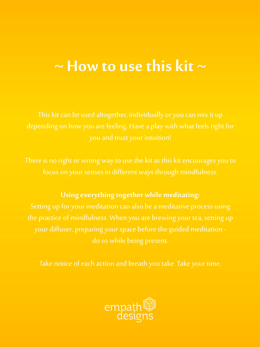 - Set aside a dedicated time for your meditation or mindfulness practice. If using the kit with the guided meditation, we recommend to set aside approximately 30 minutes.