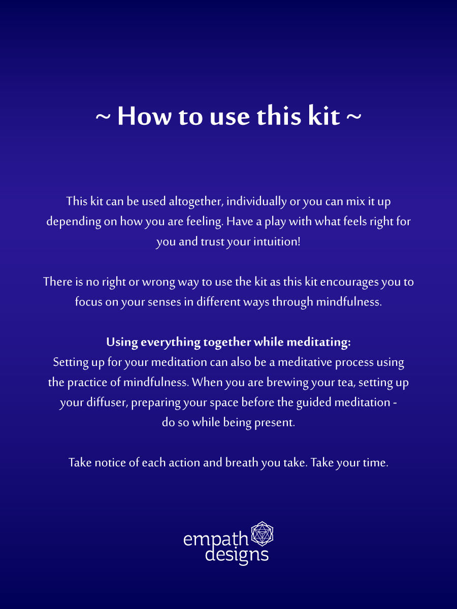Each element in this Meditation Ritual Kit can be used alone or in combination. Let it guide you inward.