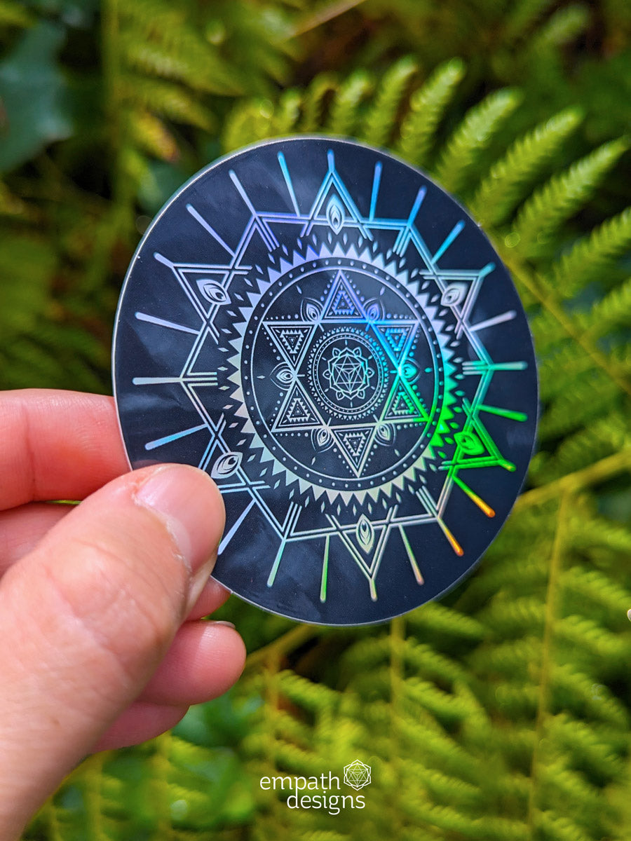 Crafted to reflect the intricate patterns of a traditional mandala, this sticker shines with a holographic finish that catches the eye and uplifts the spirit.