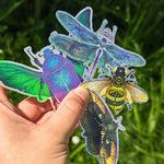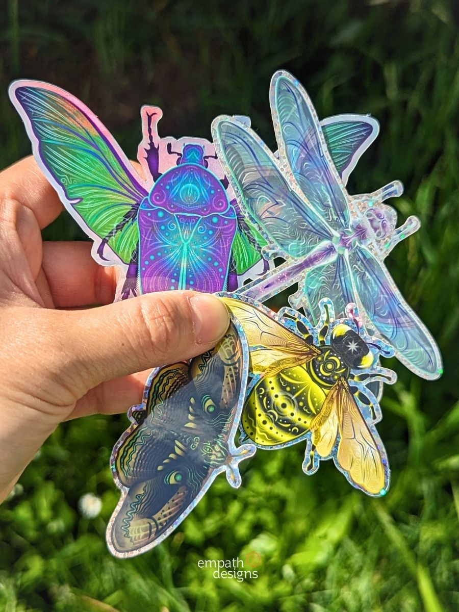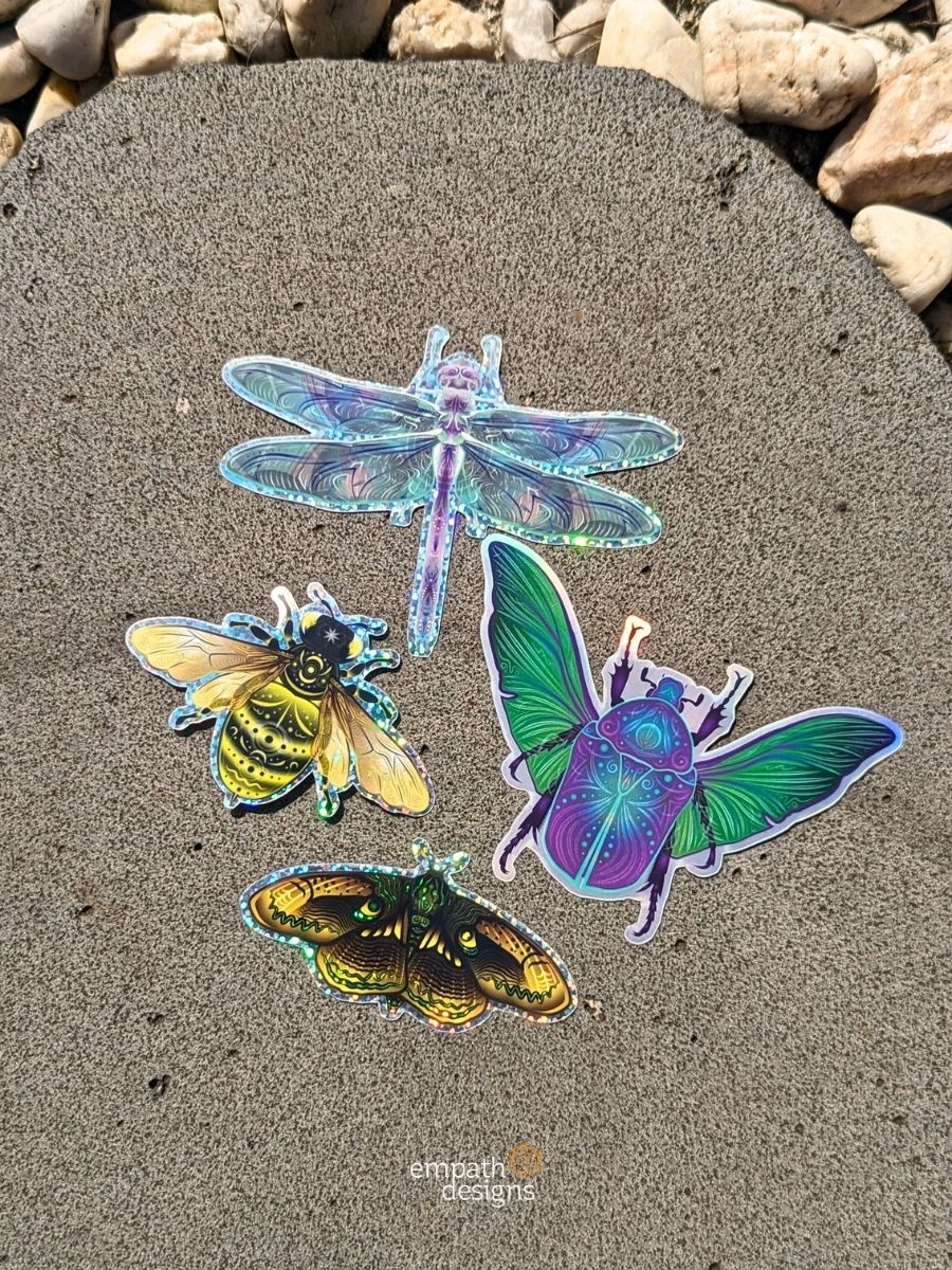 Elevate your world with our Mystical Insect Sticker Bundle, featuring enchanting designs inspired by Dragonfly Magick, Bee-luminate, Scarab Connection, and Moth Equilibrium from the Volucris collection.