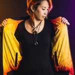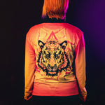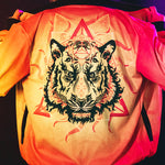 The reversible black side on the other hand allows for the wearer to appear more minimal, featuring the Empath Designs logo which is screenprinted with water ink. When unzipped, you may see a sneak preview of the orangey Ignite design during movement. Symbolically, the Tiger energy remains with you whether it is on the outside or inside.